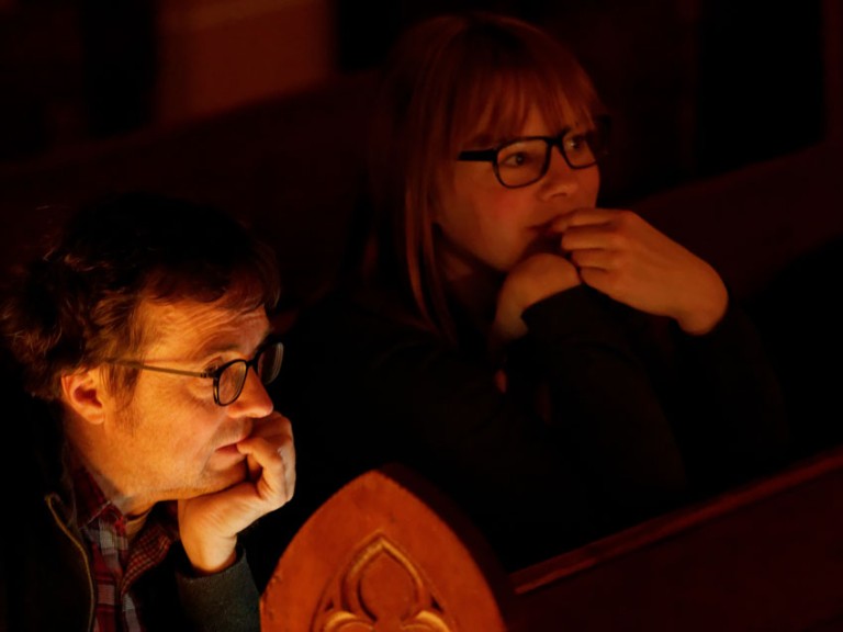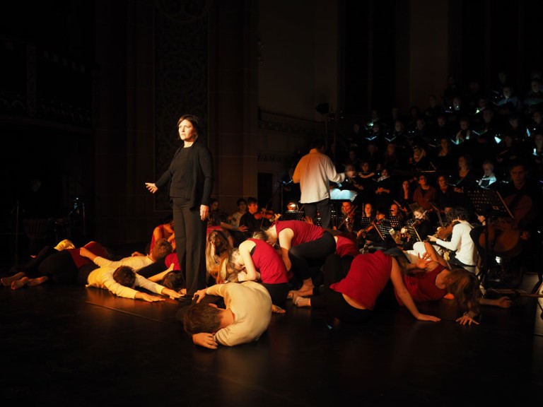 Die 10b probte, entwickelte und inszenierte nun bis zum Sommer jede Woche im Musikunterricht von Herrn Balbach mit der Unterstützung von Antje Walter und begegnete dem CrossOverChor direkt vor der langen Sommerpause. Spätestens bei der ersten gemeinsamen Probe von Tänzern, Chor und Orchester Mitte November zeigte sich, dass die Sache auf dem richtigen Weg war. Freilich gab es in der Probenwoche, die den beiden Aufführungen unmittelbar vorausging, noch viel zu tun und zu klären. Nun galt es, das Puzzle der verschiedenen Ensembles (CrossOverChor, TanzAgs, Tanzklasse 10b, Band, Orchester [Einstudierung Tine Wiechmann & Ulf Engel], TechnikAG ´ttc Gesangssolisten & Instrumentalsolisten) mit insgesamt 147 Mitwirkenden richtig zusammenzusetzen. Diese Aufgabe fiel den beiden Hauptverantwortlichen des Projekts zu: Antje Walter und Johannes Balbach. Parallel dazu wurde mit viel ehrenamtlicher Hilfe die Kreuzkirche einer nie dagewesenen Verwandlung unterzogen: Kirchenbänke wichen einer großen Tanzfläche und der Chor erhielt im Altarraum ein eigenes Gerüst (Siehe Fotos). Die ThaddenTechnikCrew ´ttc unter der Leitung von Sanne Walentin sorgte unter den erschwerten Bedingungen eines Kirchenraumes für Licht, Ton und sogar Liveübertragung auf Leinwand, damit man von allen Plätzen des Raumes das Geschehen gut mitverfolgen konnte. Besonders hervorzuheben ist das Engagement des Fördervereins Wieblinger Konzerte e.V., der als Veranstalter und Förderer dieses Konzertprojekt unter enormen finanziellen Aufwand erst möglich gemacht hat.